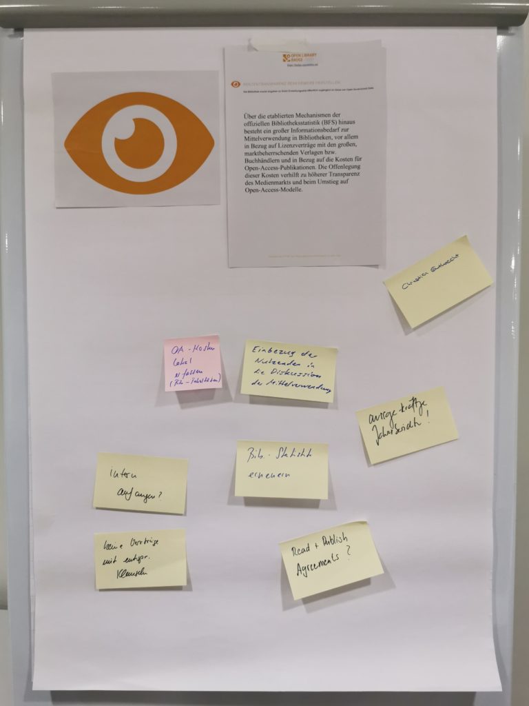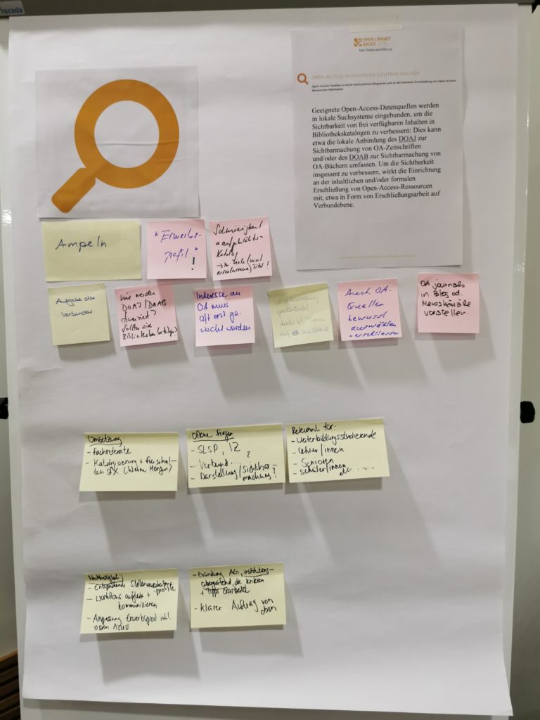 Sechs der Kriterien für den Open Library Badge wurden von Ursula Baumann und Annika Henrizi für die Gruppenarbeiten im IG-WBS-Workshop ausgesucht. Die Teilnehmenden schlossen in fünf Gruppen zusammen und arbeiteten für ihr Kriterium an den beiden Fragen: