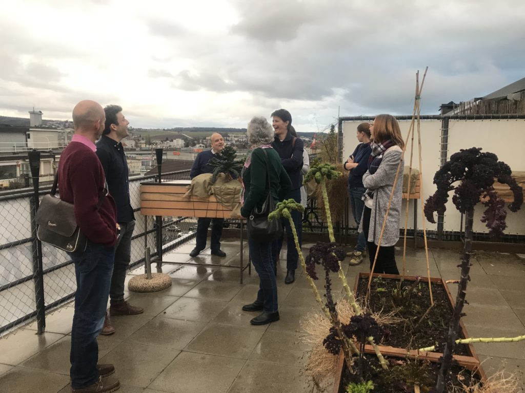 Gegen Abend erläutert Marc einer nun etwas grösseren Gruppe von IG WBS-Mitgliedern das Konzept hinter La Werkstadt. Diese kann ganz unterschiedlich genutzt werden: als Büro, als Sitzungszimmer, für Treffen mit Kunden oder als inspirierende Werkstatt. «High tech» und «high touch» sollen sich ergänzen: Das hoch digitalisierte Haus ist mit viel Holz und zahlreichen Pflanzen ausgestattet – auch auf der einladenden Dachterrasse mit Sicht auf den Bahnhof Biel.