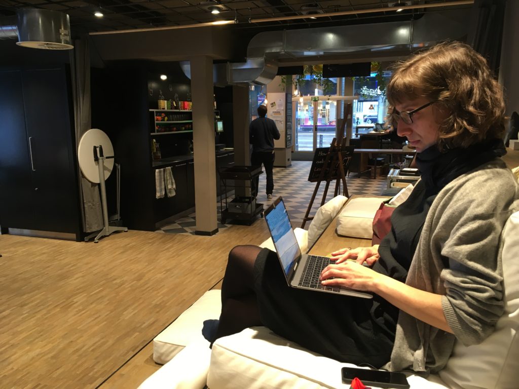 Einige der Leute auf den Sofas oder an den Tischen in unterschiedlichen Höhen haben zwar Kopfhörer aufgesetzt, aber auch die übrigen BesucherInnen tippen konzentriert in ihre Laptops.