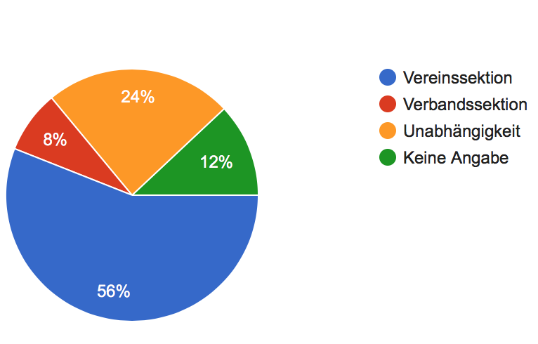 6 Personen wünschen sich, dass die IG WBS unabhängig wird (24%), während 2 Personen sich sogar dafür aussprechen, dass die IG WBS ihren Status als Verein aufgeben und Verbandssektion werden soll. 3 Umfrage-Teilnehmende machten zu dieser Frage keine Angaben.