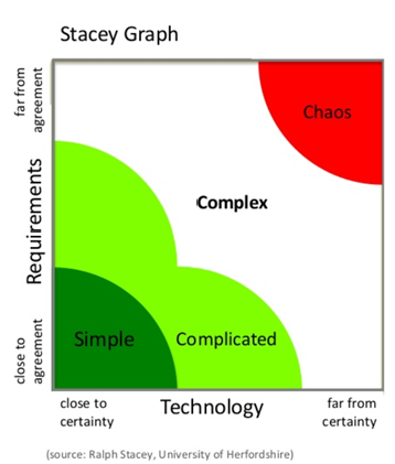 Nein, selbstverständlich nicht. Es ist längst offensichtlich geworden, dass die agilen Methoden nicht in allen Arbeitskontexten und für alle Aufgaben Sinn machen. Und natürlich muss man auch nicht auf jeden Trend aufspringen. Agile Frameworks wie Scrum erhöhen beispielsweise den Aufwand für die Steuerung und Abstimmung, wenn man sie auf einfache oder Routine-Aufgaben anwendet. Erst dann, wenn Aufgaben komplex oder gar chaotisch werden, das Ergebnis nicht bereits im Voraus und im Detail klar ist oder während der Arbeit kurzfristige Änderungen zu erwarten sind, helfen diese Methoden bei der Planung und der Realisierung der Aufgaben. Die nebenstehende Grafik von Ralph Stacey visualisiert diesen Zusammenhang auf plastische Weise.