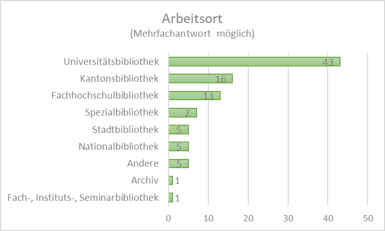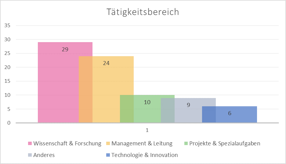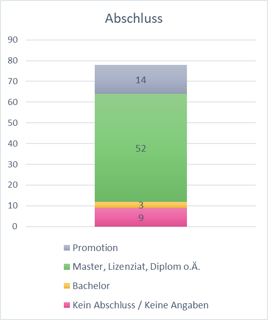 Das «typische» Mitglied der IG WBS im Jubiläumsjahr ist eine Frau (Abb. 1) im Alter zwischen 40 und 49 Jahren (Abb. 2). Irgendwann in den letzten 5 Jahren – vielleicht auch in den letzten 10 Jahren – ist sie der IG WBS beigetreten (Abb 3.). Hier trifft sie auf mindestens zwei Kolleg:innen, die schon seit der Gründung unseres Vereins im Jahr 1992 Mitglied sind. Zu diesem Zeitpunkt besuchte sie selbst vielleicht gerade mal die 4. Klasse. Oder sie machte gerade die Matura und fasste den Entschluss, eine Geisteswissenschaft zu studieren, wobei sie allerdings auch mit den Sozialwissenschaften liebäugelte (Abb. 4). Vielleicht gehört sie heute sogar zu den rund 18 Prozent unserer Vereinskolleg:Innen, die ihr Studium mit einer Promotion abschlossen (Abb. 5). Nach ihrem Studium absolvierte sie den Wi-Bi-Kurs oder erlangte einen MAS in Bibliotheks- und Informationswissenschaft (Abb. 6). Wie viele ihre Vereinskolleg:innen arbeitet sie nun an einer Universitätsbibliothek (Abb. 7) im Bereich «Wissenschaft & Forschung» oder sie hat eine Leitungsfunktion inne (Abb. 8).