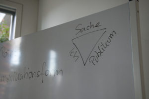 Marcel Dräger zog für seine Ausführungen das Organonmodell des Sprachpsychologen Karl Bühler herbei, bei dem die Präsentierenden («ich») dem Publikum sowie der Sache (dem Thema der Präsentation) gegenübergestellt werden. Das Modell kann hilfreich beim Hinterfragen der Gestaltung (und Ausformulierung) der eigenen Präsentation und der damit verknüpften Ziele.